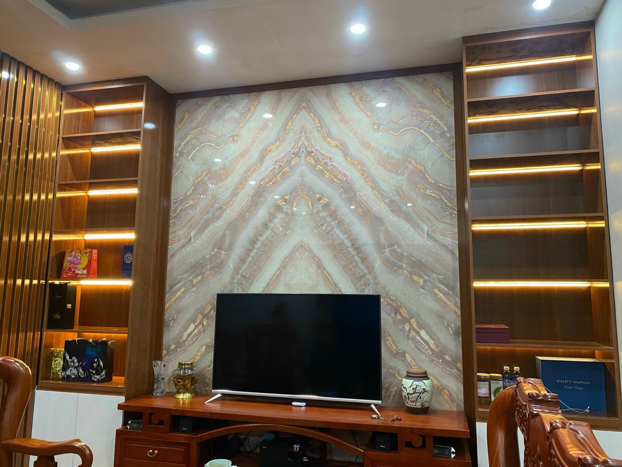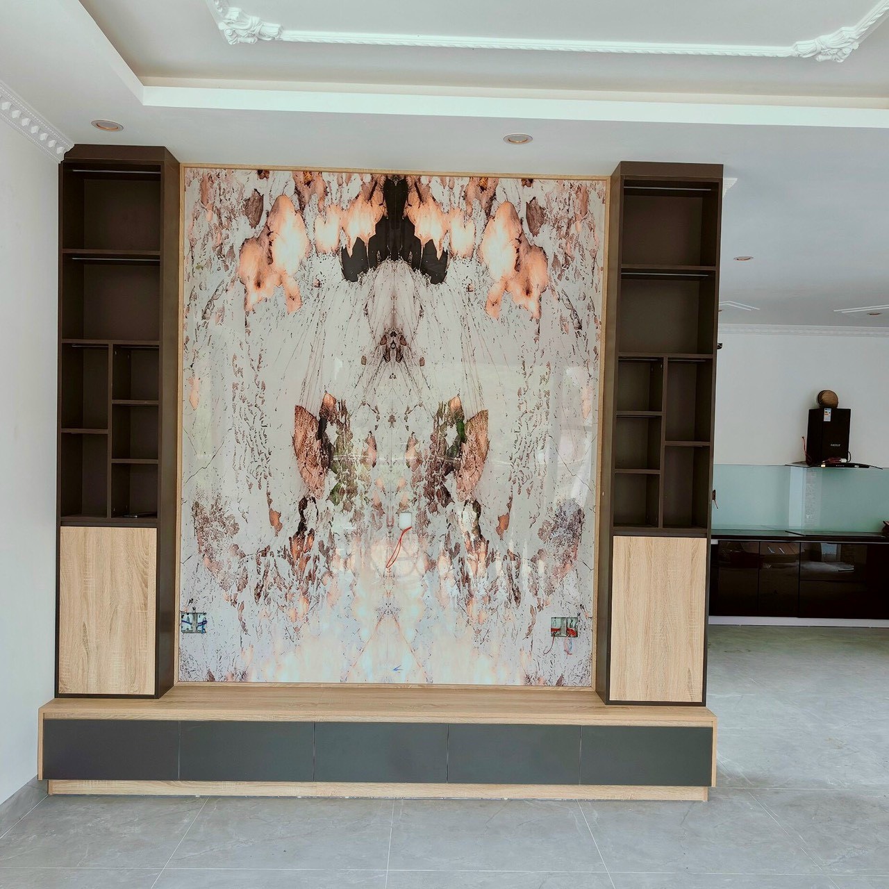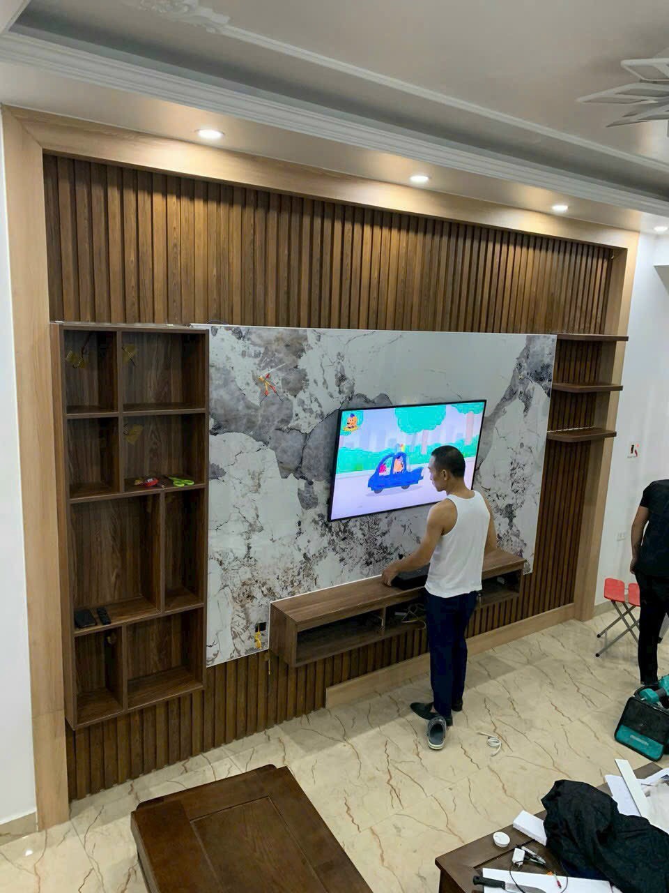 Vách phòng khách thiết kế theo yêu cầu chất liệu gỗ công nghiệp màu sắc tuỳ chọn kích thước tuỳ chọn giá từ 1tr/m2 đo đạc trực tiếp tại nhà khách hàng